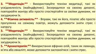 3. **Медитація:** - Використовуйте техніки медитації, такі як усвідомленість (майндфулнес). Зосередьтеся на своєму диханні, повторюйте мантру або просто спостерігайте за своїми думками, не засуджуючи їх.4. **Фізична активність:** - Вправи, такі як йога, пілатес або просто прогулянка на свіжому повітрі, можуть допомогти зняти стрес і напругу.3. **Медитація:** - Використовуйте техніки медитації, такі як усвідомленість (майндфулнес). Зосередьтеся на своєму диханні, повторюйте мантру або просто спостерігайте за своїми думками, не засуджуючи їх.5. **Ароматерапія:**-Використання ефірних олій, таких як лаванда, м'ята або евкаліпт, може допомогти заспокоїтися і зняти стрес.