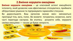 2. Вміння керувати емоціями. Вміння керувати емоціями – це ключовий аспект емоційного інтелекту, який дозволяє нам ефективніше спілкуватися, приймати обґрунтовані рішення та підтримувати гармонійні стосунки. Ви дорослішаєте. Ваш організм зазнає змін: змінюються пропорції тіла, вага, голос. Ви можете почуватись незвично, мати часті перепади настрою. Ви вчитесь розуміти себе, керувати своїми емоціями — часом це буває непросто.