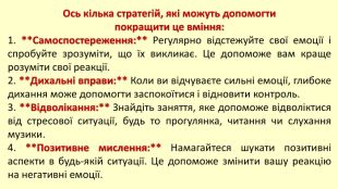 Ось кілька стратегій, які можуть допомогти покращити це вміння:1. **Самоспостереження:** Регулярно відстежуйте свої емоції і спробуйте зрозуміти, що їх викликає. Це допоможе вам краще розуміти свої реакції.2. **Дихальні вправи:** Коли ви відчуваєте сильні емоції, глибоке дихання може допомогти заспокоїтися і відновити контроль.3. **Відволікання:** Знайдіть заняття, яке допоможе відволіктися від стресової ситуації, будь то прогулянка, читання чи слухання музики.4. **Позитивне мислення:** Намагайтеся шукати позитивні аспекти в будь-якій ситуації. Це допоможе змінити вашу реакцію на негативні емоції.