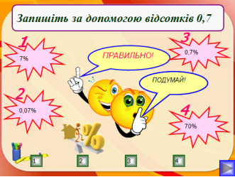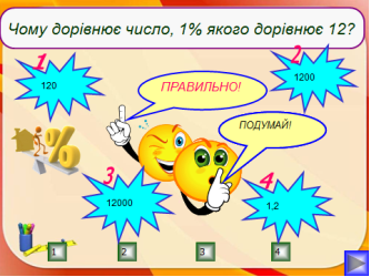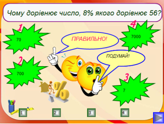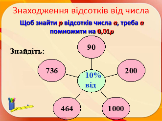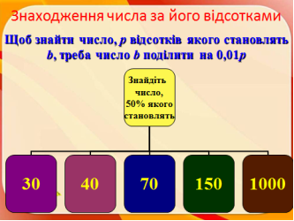Мета. Формування умінь і навичок розв’язувати задачі на відшукання відсотків від числа та числа за його відсотком; розвивати пізнавальний інтерес, логічне мислення і уяву; виховувати увагу, самостійність, доброзичливість