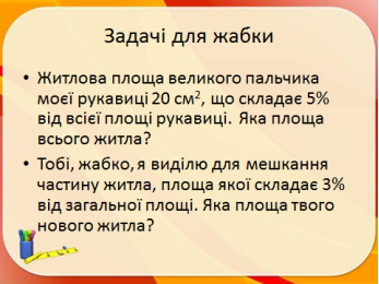 Сьогодні на уроці ми будемо розв’язувати задачі на відсотки. Для цього ми здійснимо мандрівку в казку „ Рукавичка”