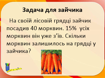 1) 15% = 0,15; 40 ∙ 0,15 = 6 ( морквин) – з’їв зайчик,