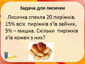1) 15% = 0,15; 20 ∙ 0,15 = 3 ( пиріжки ) – з’їв зайчик,