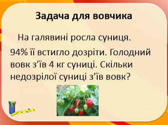 2) 6% = 0,06; 4 ∙ 0,06 = 0,24 (кг) – з’їв вовк.