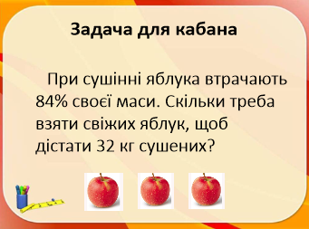 2) 16% = 0,16; 32 : 0,16 = 200 (кг) – треба взяти свіжих яблук.