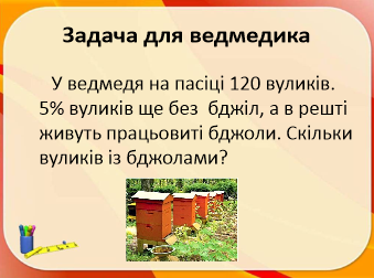 1) 5% = 0,06; 120 ∙ 0,05 = 6 (вуликів ) – міститься без бджіл,