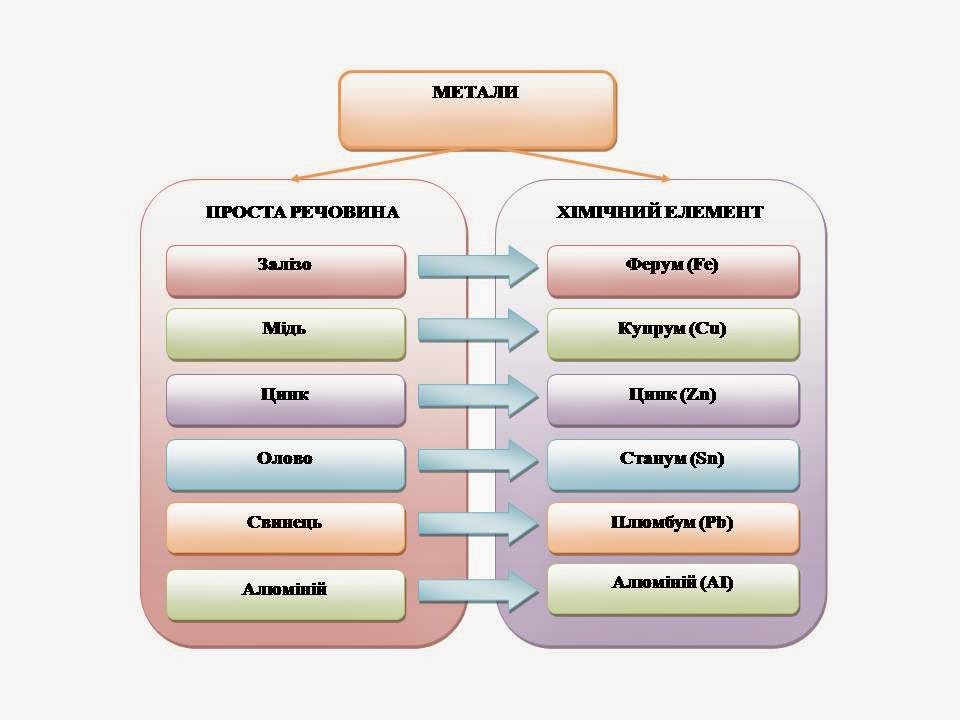 Розгляньте колекцію металів і складіть у зошиті схему, що пов'язує між собою два знайомі вам поняття «хімічний елемент» і «проста речовина