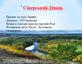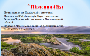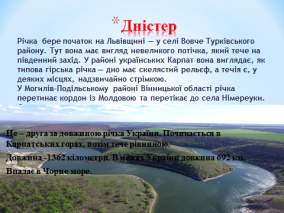 (Дніпро,Дністер,Прут,Прип’ять,Дунай,Південний Буг,Дунай,Десна,Сіверський Донець тощо)