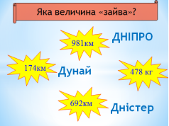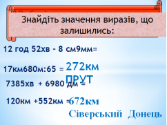 Мета.Закріплювати вміння дітей розв’язувати задачі на рух,обчислювати вирази з іменованими одиницями,письмово множити та ділити на двоцифрове та трицифрове число;розширити та систематизувати знання учнів про річки України,розвивати спостережливість,уяву,пізнавальний інтерес,уміння логічно мислити;формувати уміння працювати в парах та групах;виховувати почуття любові до природи,дбайливе ставлення до водойм,економне використання прісної води.