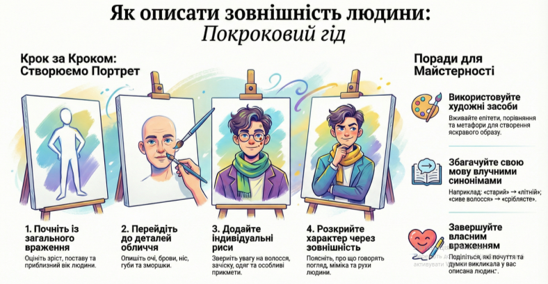 Порада: Використовуйте слова, що передають колір, світло та форму. Наприклад: «волосся кольору стиглого жита», «погляд, глибокий мов криниця», «руки, порепані від важкої праці».