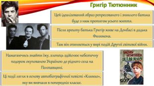 Григір Тютюнник. Цей ідеалізований образ репресованого і зниклого батька буде з ним протягом усього життя. Після арешту батька Григір живе на Донбасі в дядька Филимона. Там він опиняється у вирі подій Другої світової війни. Намагаючись знайти їжу, хлопець здійснює небезпечну подорож окупованою Україною до рідного села на Полтавщині. Ці події лягли в основу автобіографічної повісті «Климко»,яку ви вивчали в попередніх класах.