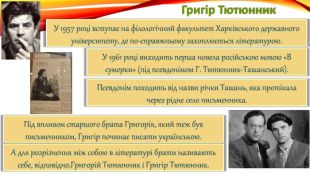 Григір Тютюнник. У щоденнику письменник залишає такий запис: Тож яким був шістдесятник Григір Тютюнник із таким трагічним світоглядом?Простежмо за його біографією та творчим шляхом. Майбутній письменник народився 5 грудня 1931 року в с. Шилівка Полтавської області. Батько Григора потрапляє під сталінські репресії в 30-тих роках, його відправляють на заслання, звідки до сина тато вже не повернеться.