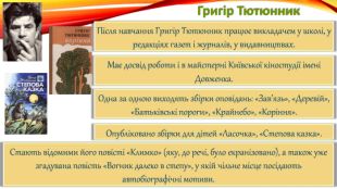 Григір Тютюнник. Після навчання Григір Тютюнник працює викладачем у школі, у редакціях газет і журналів, у видавництвах. Має досвід роботи і в майстерні Київської кіностудії імені Довженка. Одна за одною виходять збірки оповідань: «Зав’язь», «Деревій», «Батьківські пороги», «Крайнебо», «Коріння». Опубліковано збірки для дітей «Ласочка», «Степова казка». Стають відомими його повісті «Климко» (яку, до речі, було екранізовано), а також уже згадувана повість «Вогник далеко в степу», у якій чільне місце посідають автобіографічні мотиви.