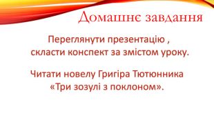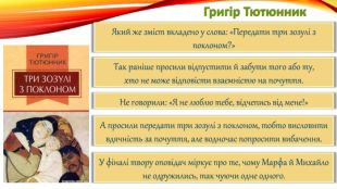 Григір Тютюнник. Який же зміст вкладено у слова: «Передати три зозулі з поклоном?»Так раніше просили відпустити й забути того або ту,хто не може відповісти взаємністю на почуття. Не говорили: «Я не люблю тебе, відчепись від мене!»А просили передати три зозулі з поклоном, тобто висловити вдячність за почуття, але водночас попросити вибачення. У фіналі твору оповідач міркує про те, чому Марфа й Михайло не одружились, так чуючи одне одного.