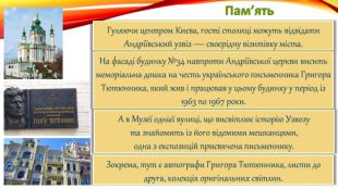 Пам’ять. Гуляючи центром Києва, гості столиці можуть відвідати Андріївський узвіз — своєрідну візитівку міста. На фасаді будинку №34 навпроти Андріївської церкви висить меморіальна дошка на честь українського письменника Григора Тютюнника, який жив і працював у цьому будинку у період із 1963 по 1967 роки. А в Музеї однієї вулиці, що висвітлює історію Узвозута знайомить із його відомими мешканцями,одна з експозицій присвячена письменнику. Зокрема, тут є автографи Григора Тютюнника, листи до друга, колекція оригінальних світлин.