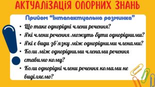Тема. Узагальнювальне слово перед однорідними членами. Мета: поглибити знання про однорідні члени речення; удосконалити вміння знаходити узагальнювальні слова при них та правильно вживати розділові знаки, визначати їх синтаксичну роль; розвивати логічне мислення, пам’ять, увагу.