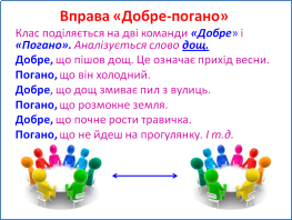 Вивчаючи тему «Подорож Крапельки», ми можемо запропонувати вправу «Добре-погано». Наприклад взяти слово «ДОЩ»