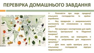 ПЕРЕВІРКА ДОМАШНЬОГО ЗАВДАННЯ Розповісти про види продукції сільського господарства та країни-виробники. Яку продукцію з американського континенту ми споживаємо у своєму раціоні? Які культури є експортними для країн Північної, Центральної та Південної Америки? Які рослини, що вирощують в Америці, є шкідливими для людського організму? Для яких країн провідну роль у сільському господарстві відіграє тваринництво?