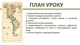 План уроку1. Вторинний сектор економіки Америки2. Основні осередки економіки в регіоні 3. «Бананові республіки»: типові ознаки та сучасний розвиток4. Третинний сектор економіки. 5. Нерівномірність економічного розвитку субрегіонів Америки. Особливості їх участі в міжнародному поділі праці. 6. Зв’язки України з країнами Америки