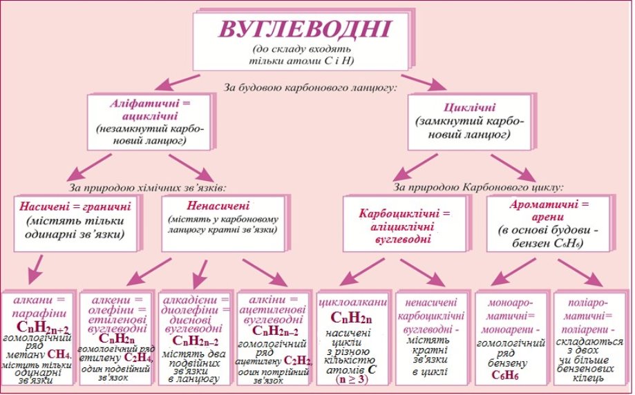 Рисунок 9.1 – Класифікація вуглеводнів за будовою карбонового ланцюгу і характером зв’язків між атомами карбону