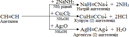 Термінальні алкіни здатні відщеплювати атом Н при потрійному звязку і виявляти слабкі кислотні властивості за рахунок помітної поляризації звязку С–Н. Це зумовлюється, по-перше, виникненням часткового негативного заряду на атомі карбону завдяки підвищеній електронній густині потрійного звязку, а по-друге, – sp- гібридизованим станом атома С, що збільшує його відносну електронегативність (порівняно із sp2- i sp3-гібридизованими атомами карбону). Названі чинники сприяють заміщенню атома Н при потрійному звязку на метал при дії відповідних реагентів, наприклад: