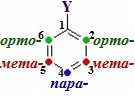 (табл. 9.2) у бокових ланцюгах та їх положення. Для багатьох моно ядерних аренів вживають тривіальні назви, які набули настільки широкого розповсюдження, що їх було введено в правила номенклатури IUPAC. Якщо бензенове кільце містить два однакові радикали, то залежно від їх взаємного розташування використовують додаткові префікси – орто- (2,6-положення відносно головного замісника Y), мета- (3,5- положення) і пара- (4-положення):