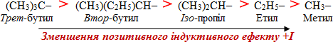 Позитивний індуктивний ефект (+І) виявляють електронодонори – атоми і атомні групи, що притягують електронні пари зв'язку слабше, ніж атоми Н; +І- ефект характерний для атомів металів Ме і насичених алкільних радикалів –CnH2n+1; причому, чим більш розгалужену будову має радикал, тим більший за величиною його позитивний індуктивний ефект: