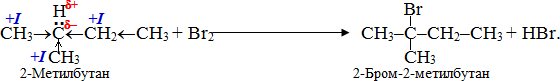 Слід зазначити, що напрямок і швидкість реакцій радикального заміщення SR, зумовлюються дією багатьох чинників. Наприклад, галогенування алканів залежить, по- перше, від природи галогену: з F2 взаємодія проходить енергійно, іноді з вибухом, з Cl2 – при опромінюванні світлом (h), з Br2 – при ультрафіолетовому опромінюванні (УФ) чи при нагріванні, з І2 реакція практично не проходить. А по-друге, – від характеру атомів карбону: легше заміщується атом Н, сполучений з третинним карбоном, важче – з вторинним С і найгірше – з первинним С. Така залежність пояснюється дією індуктивних ефектів: