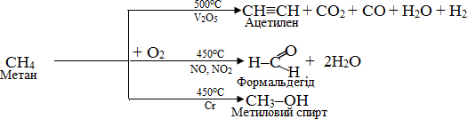 За жорстких умов алкани піддаються реакціям дегідрування – відщеплення атомів Н, яке може проходити різними шляхами. Практичного значення має крекінг алканів – процес хімічного розщеплення нафтових вуглеводнів при високих температурах (400 - 6000C) чи в присутності каталізаторів, внаслідок чого відбувається розрив звязків між атомами і утворюються вуглеводні, які можуть мати меншу кількість атомів карбону в молекулі, кратні звязки чи розгалужений ланцюг. Для метану найчастіше проводять піроліз – розклад при температурах вище 9000 за такими схемами: