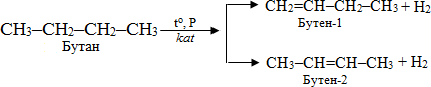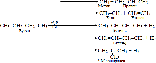 Продуктами крекінгу алканів з довгим ланцюгом є суміш вуглеводнів різної довжини карбонового скелету і різної насиченості, а також водень. Наприклад, найбільш імовірні процеси під час крекінгу бутану протікають за схемами: