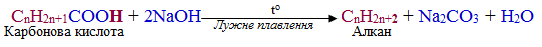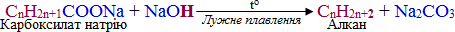 Ще одним поширеним методом отримання алканів є декарбоксилювання солей (або, точніше, карбоксилатів) лужних металів – відщеплення карбоксильної групи (СООН чи СООМе) за реакцією Дюма, або реакція лужного плавлення, що проходить відповідно до загальної схеми, на якій для наочності виділено склад побічного продукту – натрій карбонату: