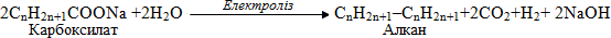 Декарбоксилювання солей шляхом інколи проводять при електролізі водних розчинів солей (карбоксилатів) лужних металів – реакція Кольбе. При цьому на аноді внаслідок окиснення кислотного залишку утворюються алкільні радикали (СnH2n+1), які мають підвищену реакційну здатність завдяки наявності неспареного електрона і дуже швидко сполучаються один з одним в молекулу алкану з більш довгим ланцюгом: