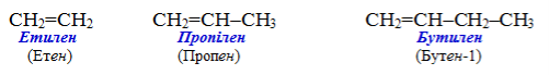 Номенклатура алкенів. При утворюванні назви етиленового вуглеводню, суфікс -ан відповідного алкану замінюють на -ен (чи -єн), який вказує на подвійний зв’язок: етан СН3–СН3, етен СН2=СН2. У назвах сполук з більш довгим ланцюгом після суфікса (через дефіс) необхідно вказувати локант – номер атома С в карбоновому ланцюгу, від якого починається подвійний зв’язок.