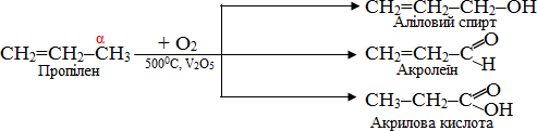 Для алкенів з довгим ланцюгом можуть проходити реакції заміщення атомів гідрогену в -положенні відносно подвійного звязку. Як правило, це реакції окиснення при температурах 350–5000С киснем в присутності каталізатора V2O5, причому залежно від тривалості зіткнення вихідних речовин утворюються різні продукти: