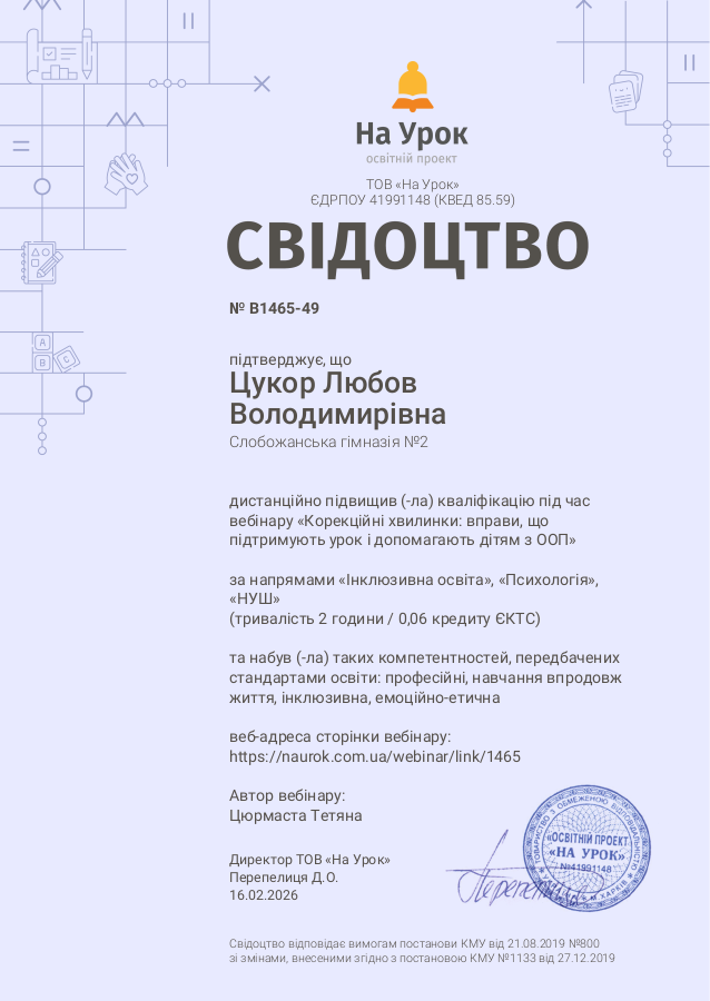 Свідоцтво підвищення кваліфікації «На Урок» містить усі дані, визначені чинним законодавством (тема, напрями, компетентності, години тощо).
