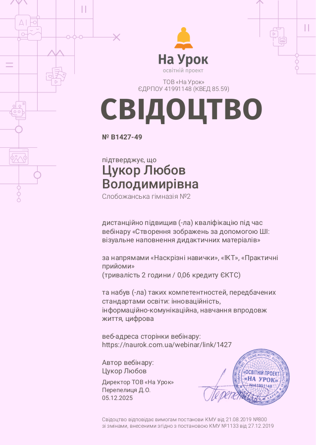 Свідоцтво підвищення кваліфікації «На Урок» містить усі дані, визначені чинним законодавством (тема, напрями, компетентності, години тощо).