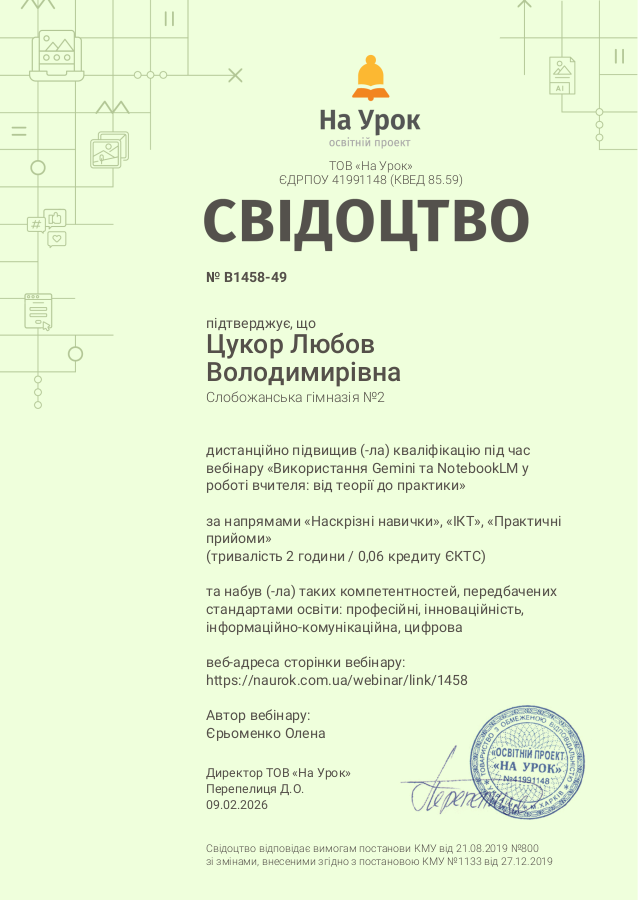 Свідоцтво підвищення кваліфікації «На Урок» містить усі дані, визначені чинним законодавством (тема, напрями, компетентності, години тощо).
