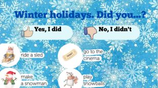 On holidays I visited ____________________________________________________ The weather was ______________________________________________________ I played __________________________ with ________________________________ I ate ____________________________ with ________________________________ I saw ________________________________________________________________ As my presents I had got_______________________________________________My winter holidays
