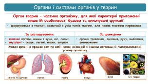 Органи і системи органів у тваринкол{5 FD0 F851-EC5 A-4 D38-B0 AD-8093 EC10 F338}Орган тварин - частина організму, для якої характерні притаманнілише їй особливості будови та виконувані функції.формуються з тканин, зазвичай з усіх типів тканин, але певна тканина переважає{BDBED569-4797-4 DF1-A0 F4-6 AAB3 CD982 D8}За розташуванням. За функціямизовнішні органи, якими є вуха, ніс, лапи;внутрішні - серце, легені, нирки, шлунокоргани травлення, дихання, руху, виділення, розмноження. Жоден орган не працює сам по собі, кожен зв’язаний з іншими органами й підпорядкований усьому організму. Печінка та шлунок. Легені Нирка. Серце Вухо{E8 B1032 C-EA38-4 F05-BA0 D-38 AFFFC7 BED3}Очі тварин
