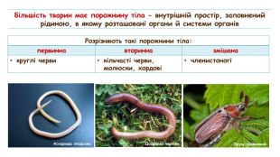 кол{5 FD0 F851-EC5 A-4 D38-B0 AD-8093 EC10 F338}Більшість тварин має порожнину тіла - внутрішній простір, заповнений рідиною, в якому розташовані органи й системи органів{BDBED569-4797-4 DF1-A0 F4-6 AAB3 CD982 D8}Розрізняють такі порожнини тіла:первиннавторинназмішанакруглі червикільчасті черви, молюски, хордовічленистоногіАскарида людська. Дощовий черв’як. Хрущ травневий