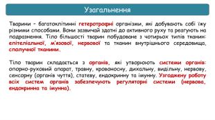 Узагальнення. Тварини – багатоклітинні гетеротрофні організми, які добувають собі їжу різними способами. Вони зазвичай здатні до активного руху та реагують на подразнення. Тіло більшості тварин побудоване з чотирьох типів тканин: епітеліальної, м’язової, нервової та тканин внутрішнього середовища, сполучної тканини. Тіло тварин складається з органів, які утворюють системи органів: опорно-руховий апарат, травну, кровоносну, дихальну, видільну, нервову, сенсорну (органів чуття), статеву, ендокринну та імунну. Узгоджену роботу всіх систем органів забезпечують регуляторні системи (нервова, ендокринна та імунна).