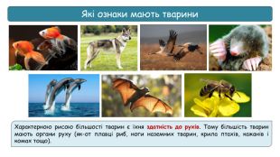 Які ознаки мають тварини. Характерною рисою більшості тварин є їхня здатність до рухів. Тому більшість тварин мають органи руху (як-от плавці риб, ноги наземних тварин, крила птахів, кажанів і комах тощо).