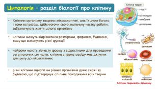 {5 FD0 F851-EC5 A-4 D38-B0 AD-8093 EC10 F338}Клітини організму тварини мікроскопічні, але їх дуже багато, і вони всі разом, здійснюючи свою маленьку частку роботи, забезпечують життя цілого організмуклітини можуть відрізнятися розмірами, формою, будовою, тому що виконують різні функції;нейрони мають зірчасту форму з відростками для проведення регулюючих сигналів, клітина сперматозоїду має джгутик для руху до яйцеклітини;різні клітини одного чи різних організмів дуже схожі за будовою, що підтверджує спільне походження всіх тваринкол. Клітини тваринного організмунейронсперматозоїдяйцеклітинаеритроцитостеоцитлейкоцитвійковий епітелій. Цитологія – розділ біології про клітину