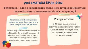 Християнському Великодню вже понад 2 000 років. Якщо рахувати в днях, це приблизно 730 000 днів!Великдень — одне з найдавніших свят, і його історія вимірюється тисячоліттями та величезною кількістю традицій. Математика крізь віки У 2011 році в селі Отинія виготовили паску вагою 450 кг. Скільки дітей зможуть нею поласувати, якщо порція становить 150 г?Найбільша у світі писанка знаходиться в Канаді (м. Вегревіль). Її довжина — 9 метрів, а вага — понад 2200 кг (або 2,2 тонни). Вона складається з 3 500 алюмінієвих трикутників та зірок. Рекорд України: