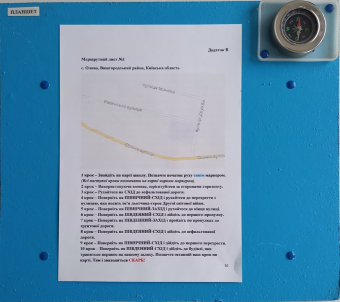 Слово вчителя. Для пошуку скарбу ви отримаєте планшет (Додаток Б) з маршрутним листом (Додаток В), компасом і кольоровими маркерами. Кому доручимо це «добро»? (Діти обирають такого учня, він же і буде ватажком). В маршрутному листі вказані всі ваші дії по кроково. Виконуючи вказівки і відмічаючи свій маршрут на карті – ви дістанетеся довго омріяного скарбу. Успіхів! Вчитель супроводжує шукачів скарбів, та допомагає при необхідності.