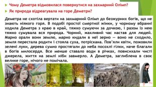 Чому Деметра відмовилася повернутися на захмарний Олімп? Як природа відреагувала на горе Деметри?Деметра не схотіла вертати на захмарний Олімп до безжурних богів, що не знають ніякого горя. В подобі простої смертної жінки, у чорному вбранні ходила Деметра з краю в край, тяжко сумуючи за дочкою, і разом із нею тяжко сумувала вся природа. Чорний, жахливий час настав для людей. Марно орали вони землю, марно кидали в неї зерно — воно не сходило, земля перестала родити і стояла суха, потріскана. Пов’яли квіти, пожовкли зелені луки, дерева сумно простягали до неба посохлі гілки, наче благали в богів милосердя. Все менше ставало води в річках, повисихали чисті джерела, життя на землі ніби завмерло. А Деметра, заглиблена в своє велике горе, нічого не помічала.