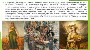 Про зміну сезонів складено чимало міфів, у греків – це міф про Деметру та Персефону. Деметра була богинею родючості, без її догляду нічого не могло рости й давати плоди. Богиня опікується врожаєм, вирощує дерева, квіти, плоди… Не випадково, її ще називають богинею землеробства. Від душевного стану богині Деметри залежать і врожай, і погода.