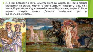 Аналіз міфу про Деметру і Персефону. Чому розвиток подій міфу про Деметру і Персефону починається з характеристики богині та опису її зовнішнього вигляду? З давніх-давен шанували смертні люди Деметру. Це вона навчила людей обробляти землю, користатися її дарами, вона щедро давала людям достаток і мир. Як і інші безсмертні, Деметра жила на захмарнім Олімпі, але більше любила ходити по землі. Висока, ясночола, у вінку із золотого колосся й червоних маків, встигала вона скрізь, пильнуючи, чи добре вродило у полі, чи гарно ліс зеленіє і чи соковита трава на пасовиськах. Треба було пояснити, яка вона і зовнішнє, і внутрішньо, щоб зрозуміти за що ії шанували смертні.