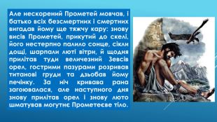 Але нескорений Прометей мовчав, і батько всіх безсмертних і смертних вигадав йому ще тяжчу кару: знову висів Прометей, прикутий до скелі, його нестерпно палило сонце, сікли дощі, шарпали люті вітри, й щодня прилітав туди величезний Зевсів орел, гострими пазурами розривав титанові груди та дзьобав йому печінку. За ніч кривава рана загоювалася, але наступного дня знову прилітав орел і знову люто шматував могутнє Прометеєве тіло.