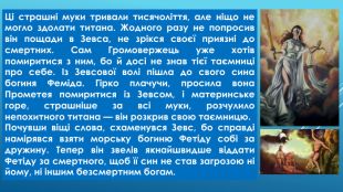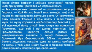 Досліджуємо текст, шукаємо відповіді на запитання: Як Прометей здобув вогонь? Хто йому допомагав у цьому?Які ще добрі справи герой зробив для людей?Яку страшну таємницю приховував Прометей? Чому вонабула важливою для Зевса?Чому Зевс розлютився на Прометея і як покарав його?Хто з них допомагає, а хто перешкоджає Прометеєві?Як довго тривали муки Прометея? Чому Прометей не підкорився Зевсові? Хто і як його звільнив? У яких випадках не можна схилятися перед владою і силою?Про яких богів і богинь ідеться в міфі? Охарактеризуйте образи Зевса, Прометея.